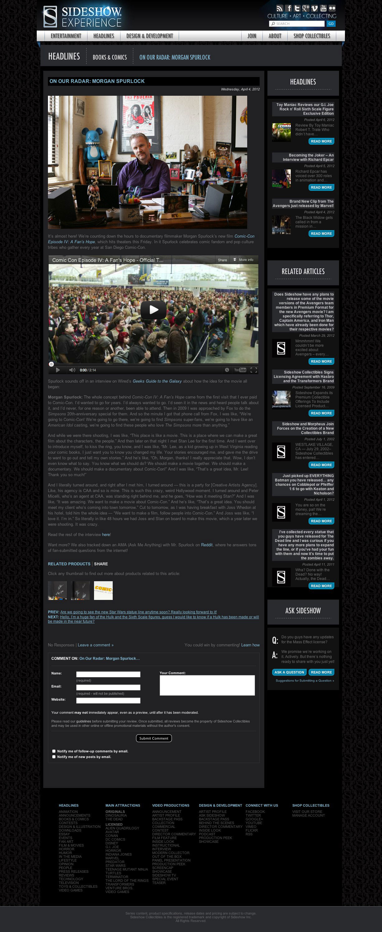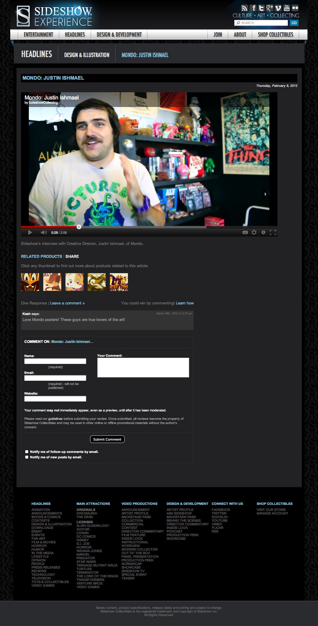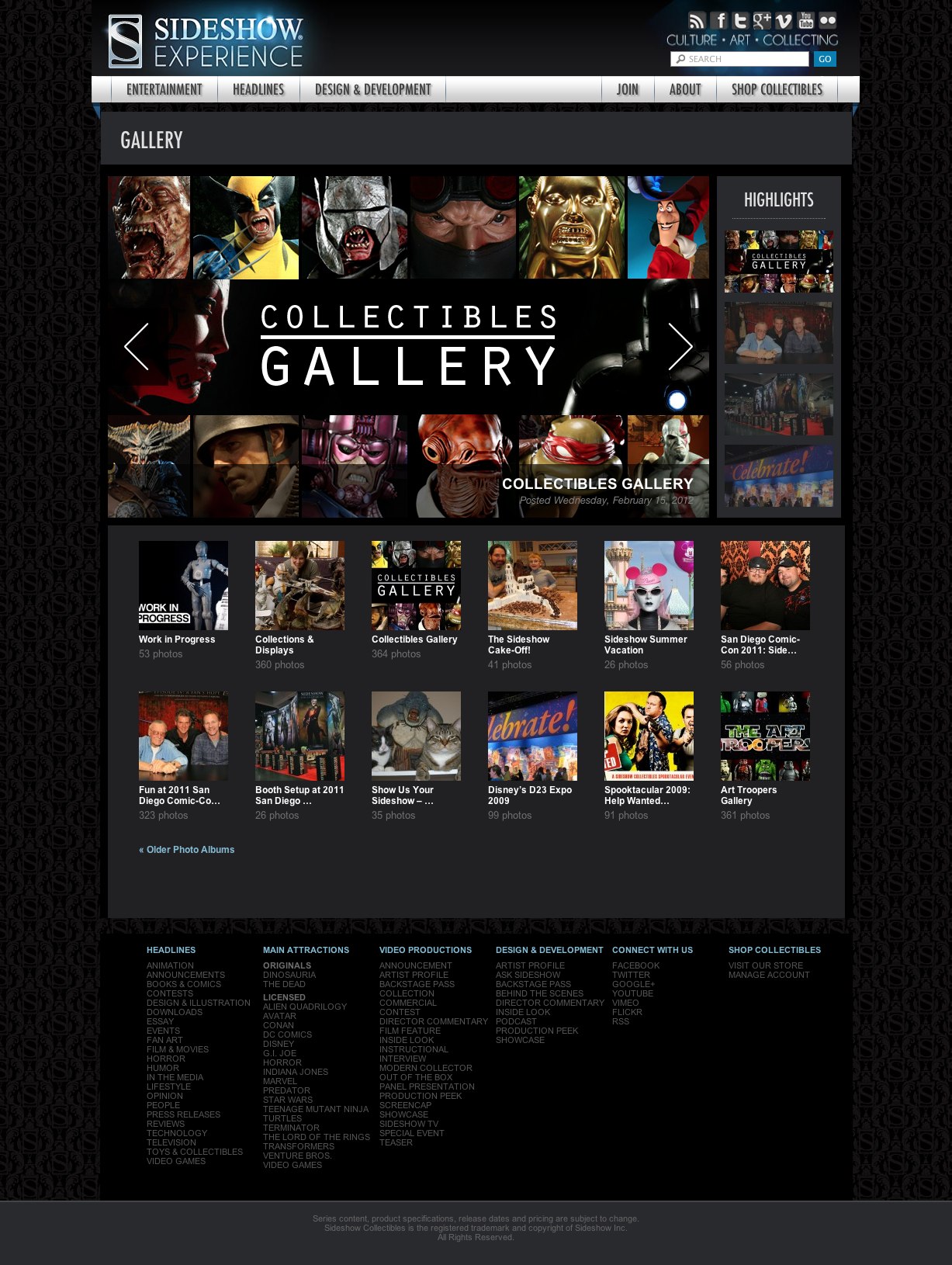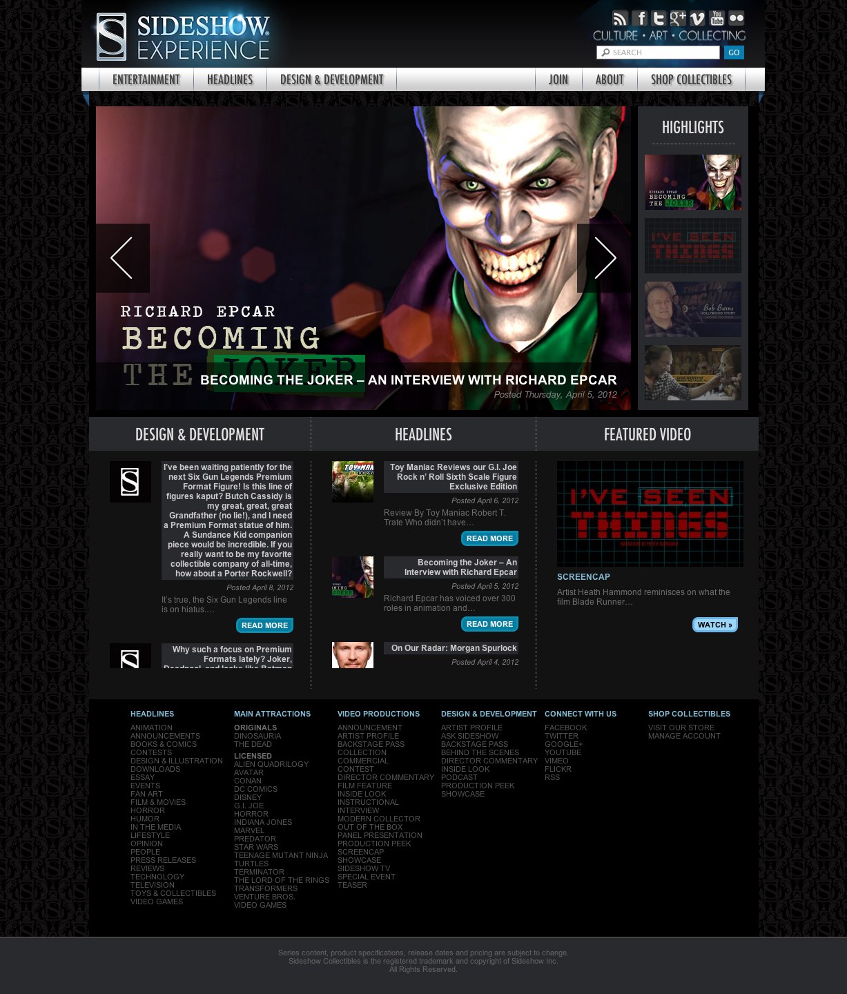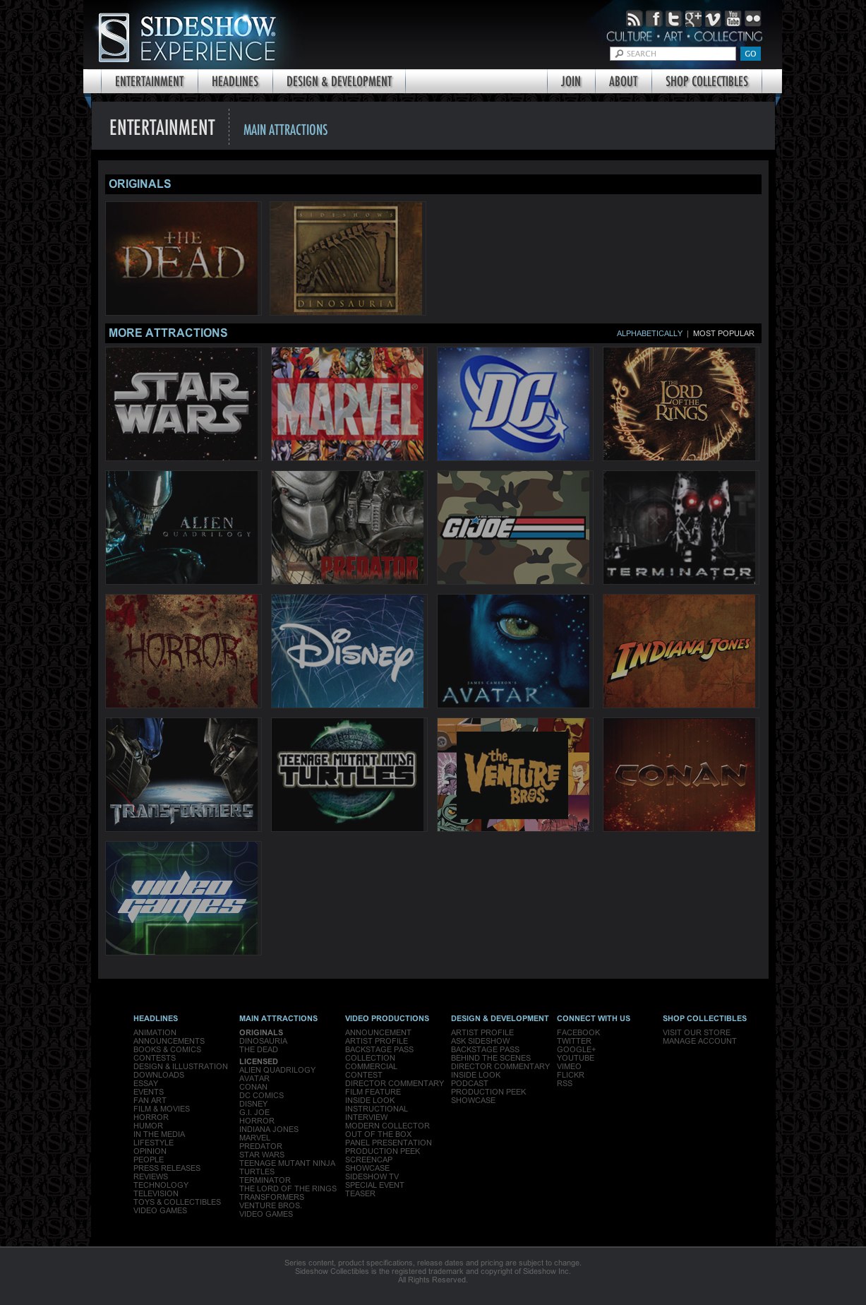 Working on the same "corporate" website for 10 years (let alone, almost 20 at this point), may seem like it could get stale. But at Sideshow, I'm fortunate enough to be a part of a great team of creative people - visually and technically - and we're never afraid to wipe the slate clean and start again. This is a fraction of the projects and pages created throughout my first ten years. Highlights include an "Experience" site featuring multimedia elements and pop culture news, various content pages and some screenshots of our first mobile site.